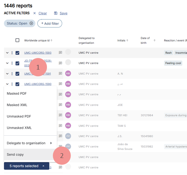2. Go to **reports selected** menu and choose **`Send copy`**.