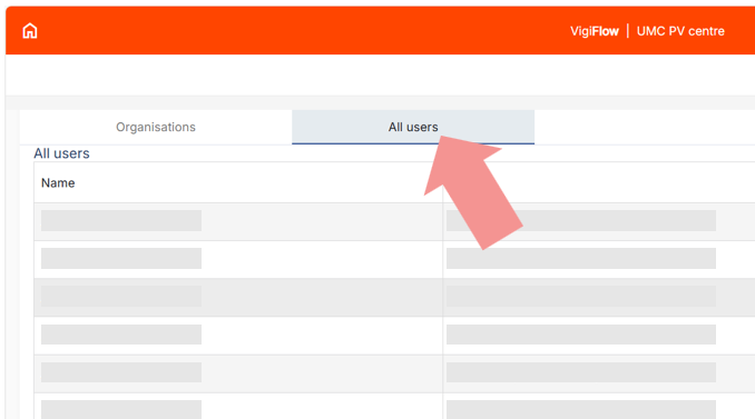 In the top menu, click the “**`All users`**” tab. This will display the updated list of all users in VigiFlow for all suborganisations, sorted by names of users. &#x20;